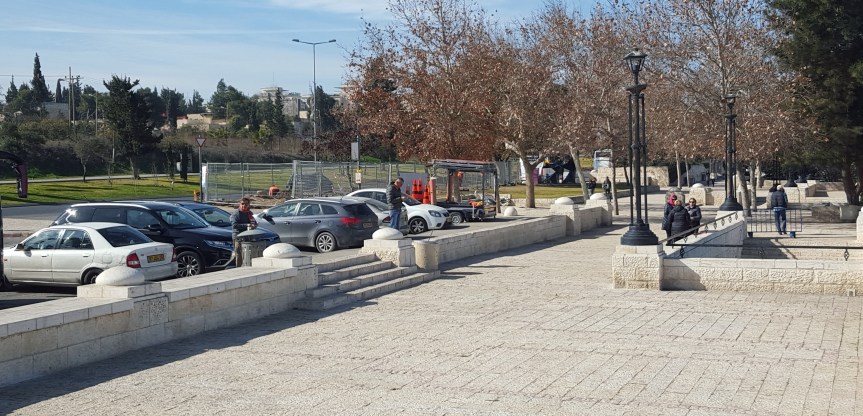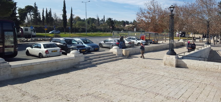 So a few days later I find myself in a taxi in Jerusalem on my way up to the scene of the crime. My taxi driver is an Arab guy from East Jerusalem. We get to the parking lot, and I tell him if he waits ten minutes he’ll get another fare back to the central bus station. He readily agrees. So I start snooping around. My first stop is to check for the surveillance camera. Of course, I could see as soon as we pulled up that there was no surveillance camera where I expected one to be. Here’s a picture of the plaza where the soldiers were standing in a circle: