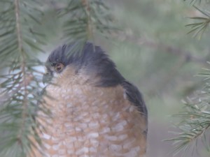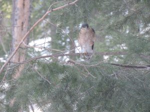 This particular bird sat on that branch for maybe half an hour, and during that time not one bird offered up a target for him/her. (Male/female sharp shinned hawks are virtually identical in appearance.) Often when they come around we will find a pile of feathers, or see feathers on a beak. This time it had no luck. In fact, I wondered if this is a young bird, as it lacked stealth. All predators develop tricks to trap their prey. I would think this one would want to stay a little more hidden, and then swoop. Its position here is maybe twenty feet from the feeders. It left empty-handed, or empty-taloned, I should say.