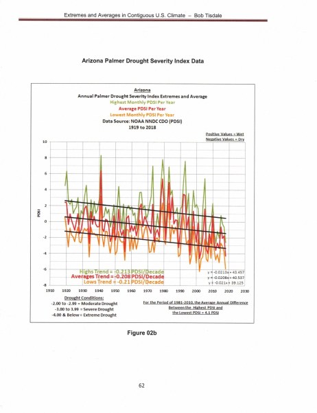 NOAA uses a scale of -4 (extreme drought) to +4 (extremely moist). That in mind, it is best to simply view the Tisdale graph and draw conclusions. Keep in mind that top of graph is moisture and bottom is absence of moisture, so that a declining line means a general increase in drought conditions. The high trend (green) line shows that PDSI has been increasing at .046 per decade over the last 100 years. The entirety of the moving average of the green line is contained between -2 and 2. NOAA qualifies that as “mid-range dryness, but not critical. The averages trend (red) line is also contained within that range, while the lows trend crosses into moderate drought.