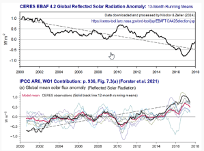The results from the trend inversion of CERES radiation data in the IPCC AR6 are highly consequential. Thus, Fig. 7.3 creates a false impression that the solar forcing played no role in recent warming and the rising concentrations of atmospheric greenhouse gases caused a retention of heat in the climate system by impeding the outgoing LW radiation. The truth is that the solar forcing explains the entire tropospheric warming since 2000, and there is no sign of “heat trapping” by greenhouse gases in the system. Had the IPCC acknowledged the increase of Earth’s sunlight absorption in the 21st Century, this would have invalidated the Report’s central assertion that human carbon emissions were the main driver of climate in recent decades. In conclusion, it appears that radiative flux anomalies in Fig. 7.3 were manipulated and a discussion about long-term all-sky CERES trends in Section 7.2.2 was intentionally omitted, because the actual observations present a significant empirical challenge to the UN’s political Agenda to promote Anthropogenic Climate Change … [emphasis added.]