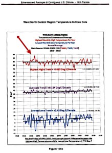 I don’t recall any decade since the 1930s that has produced such suffering and tragedy as the 1930s, and Oklahoma is not even included on the list above. Oklahoma did have heat spikes in the 1930s, 1954, 1980 and 2011 that were all very hot, with the highest high monthly temps in the 100-108°F range. But in general Oklahoma temperatures during that 100 year period were flat, increasing .109°F per DECADE (1.09°F per century), which to human skin is not even perceptible. Nonetheless, that place is just hot. I have a cousin who lives in Oklahoma City. I think that heat messes with minds.