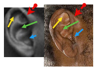Notice the two red arrows. They point at the upper helix on each, which to me look identical. Green arrows point at the concha/upper concha, which lighting distorts a bit, but which oddly reflects the upper bar of light on both (R) and (L) photo. The yellow arrow pointing at the upper antihelix, pronounced on both, and with the same upper curve on both. The blue arrow points at the intertragel notch, pronounced on the left, growing closed on the right.