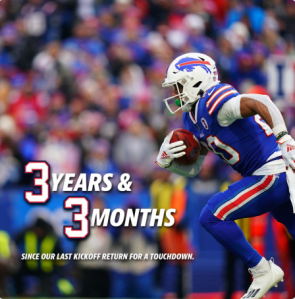 By the way, on October 20, 2019, Micah Hyde returned a Miami Dolphins onside kick 45 yards for a touchdown. That is what the ‘3 years ‘3 months’ refers to.