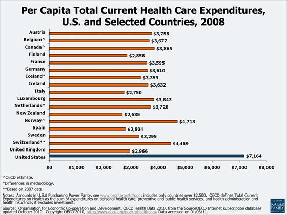 Source: OECD, 2010This is a system of perverse incentives, or conflicts of interest. As the old saying goes, a man cannot serve two masters, and the profit motive and and health care delivery are at odds with one another. Each dollar spent on health care is one less dollar available to the investors and bureaucrats who run the enclosed system. So they fight like hell to 1) exclude anyone who might be unprofitable; 2) avoid paying claims for people who have insurance; 3) pay as little as possible to health care deliverers and 4) rescind coverage for people who make large claims.
