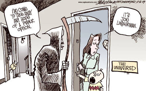 Here’s his take on what is unfolding right now: While the health insurers got most of what they wanted out of Obama’s bill, there were some unpleasant features that they want eliminated. One, they want the 80% cap on medical losses eliminated. (As outrageous as that number is, it merely froze them in time – that’s where they were already at.) There’s also a provision in the law that mandates basic benefits that must be covered, basically outlawing junk insurance. They have bought the companies that sell the junk, and so want that provision gone.