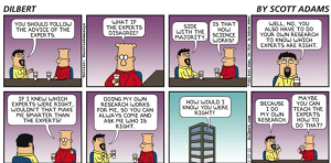 That is how experts are used in the news media. They don’t bring in experts to clarify, as in any matter of complexity, there are going to be differing views. Then, as with Dilbert above, it is up to us to decide which expert to trust.